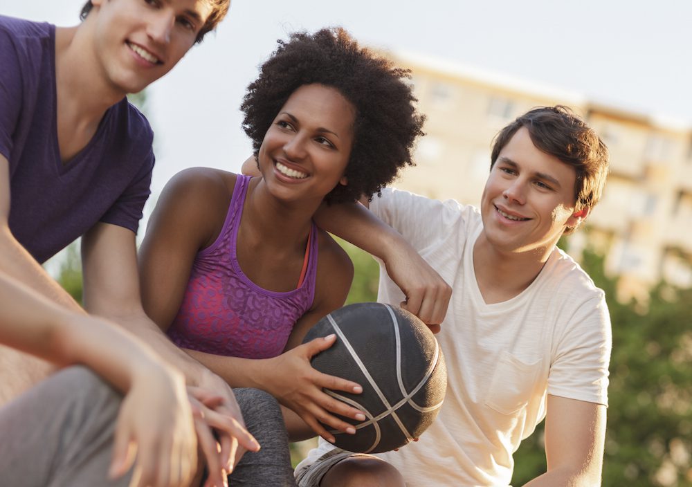 Group of friends playing a game of Basketball in a Berlin’s city park. Note to inspectors: Women in this group of images are wearing T-shirts from a $1.00 discount store. The T-shirts have the word Sports written on them.